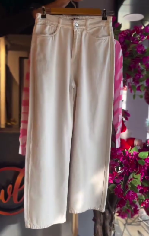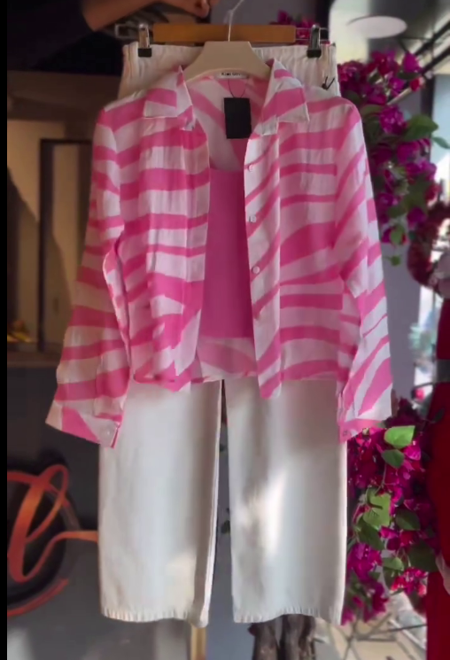 Is set me pink & white striped shirt, matching inner top aur white wide-leg pants milte hain, jo look ko stylish aur comfortable banate hain.