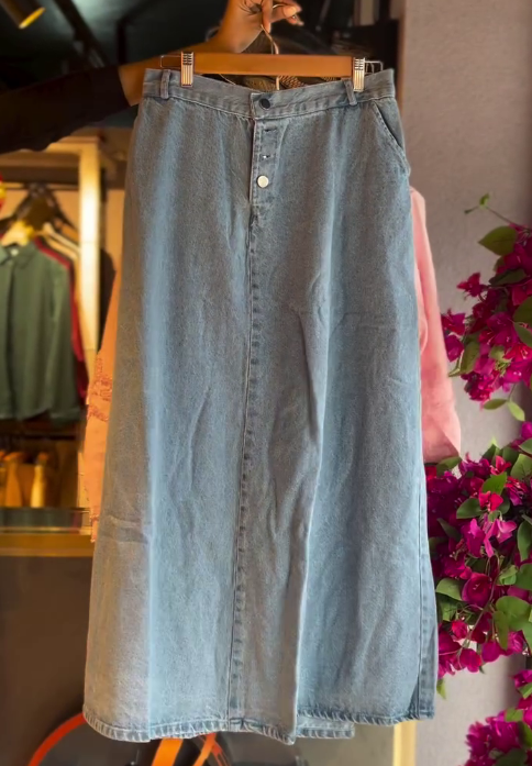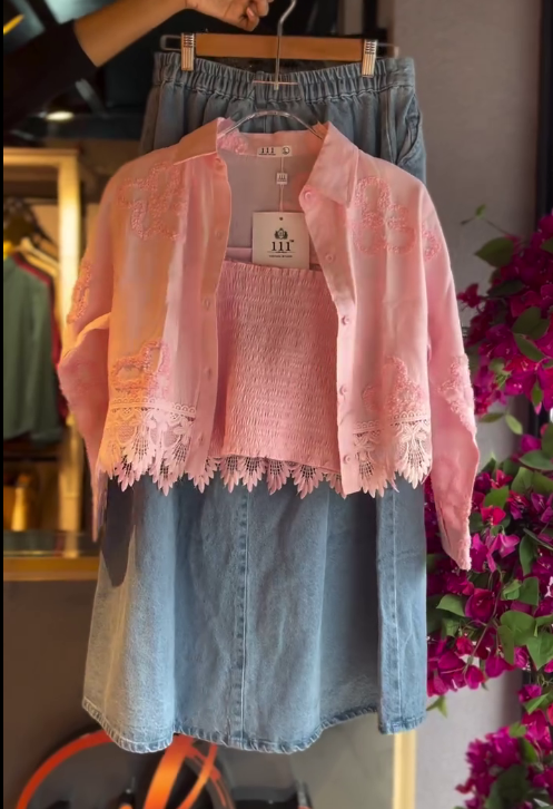 Is set me sheer lace-detailed shirt, stretchable smocked inner top aur high-waist denim midi skirt milti hai – perfect blend of elegance & casual style.